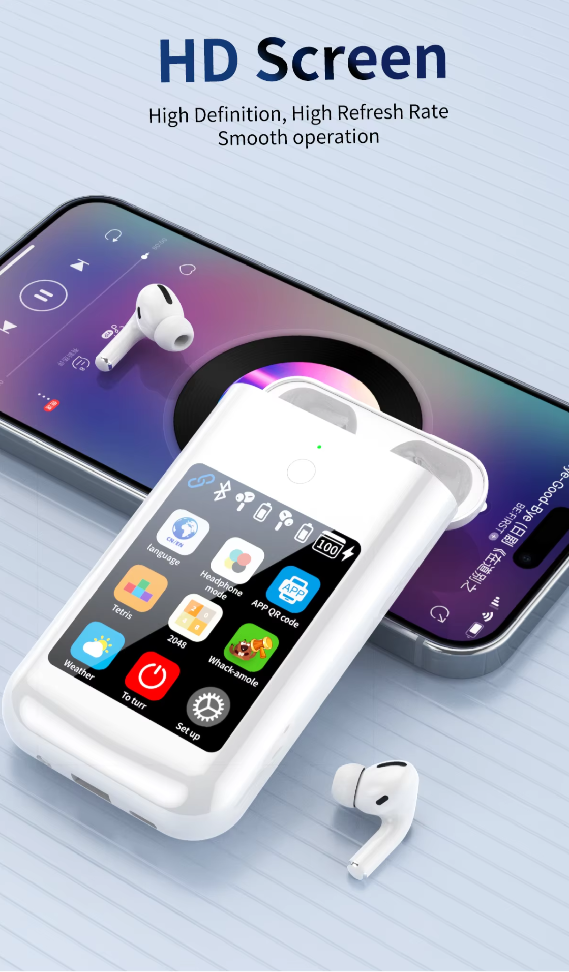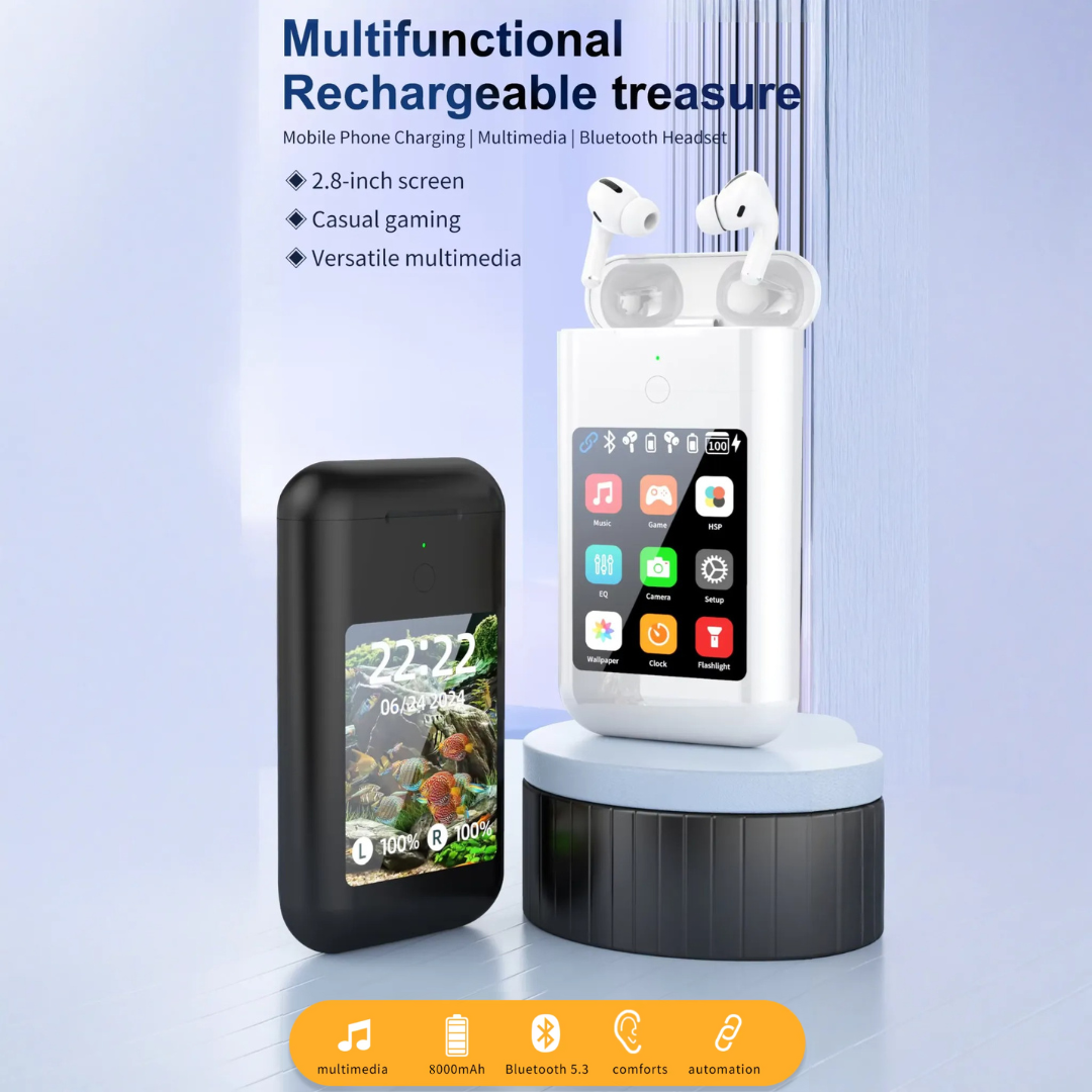 👌Elegant Digital Display: The sleek charging case features a 2.8-inch AMOLED display, offering real-time updates on battery life and connection status with a touch of elegance